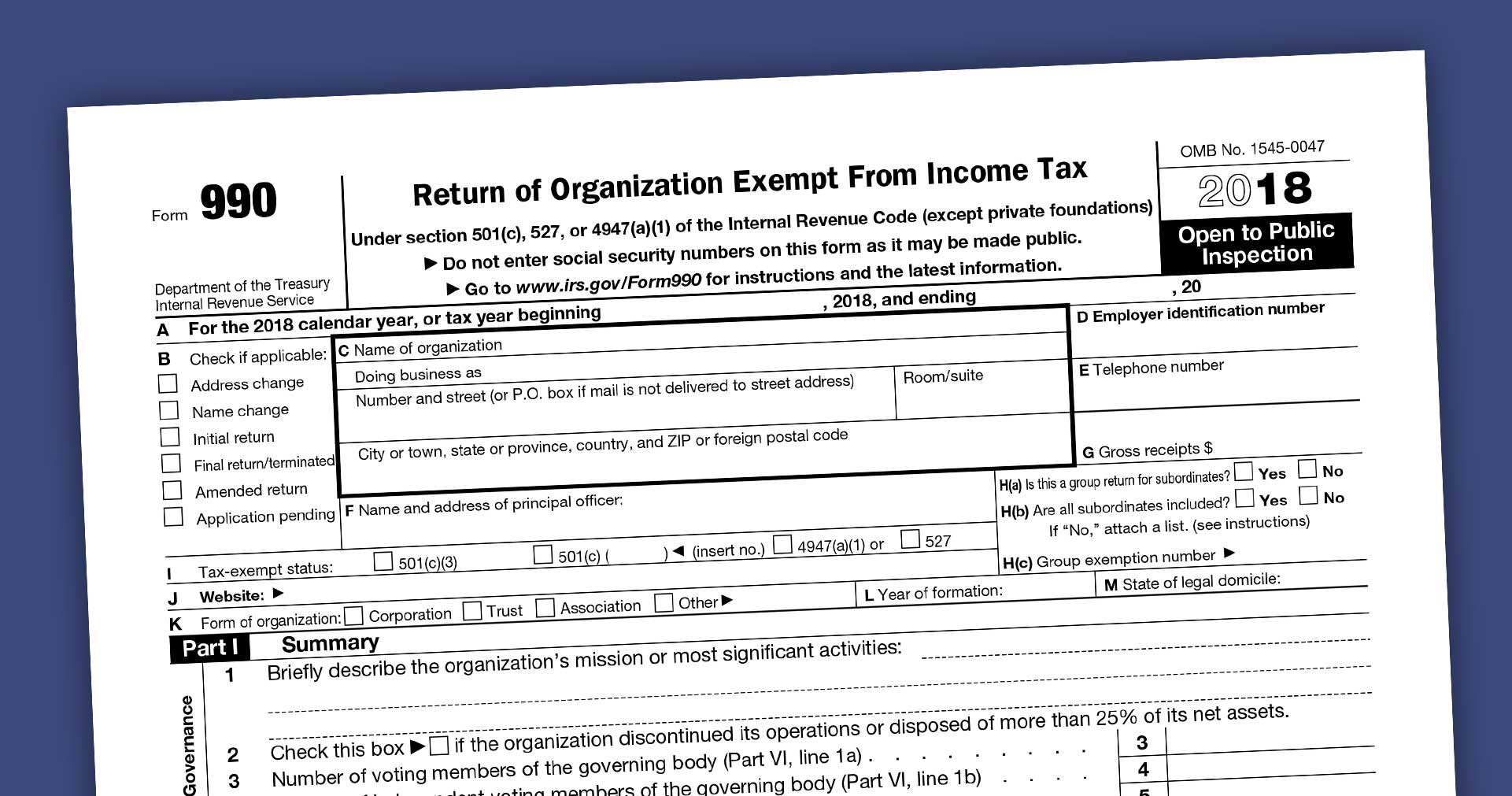 The top section of Form 990 focuses on the basic information: entity name, address, tax year, website, etc. It’s important to note for those entities that follow a fiscal year, which differs from the normal January through December calendar year that the “Tax Year” or date of your Form 990 is the calendar year that ends within the fiscal year. For example, a nonprofit with a fiscal year ending June 30, 2019, will file a 2018 Form 990 because the 2018 calendar year ended within the 2018-19 fiscal year.
